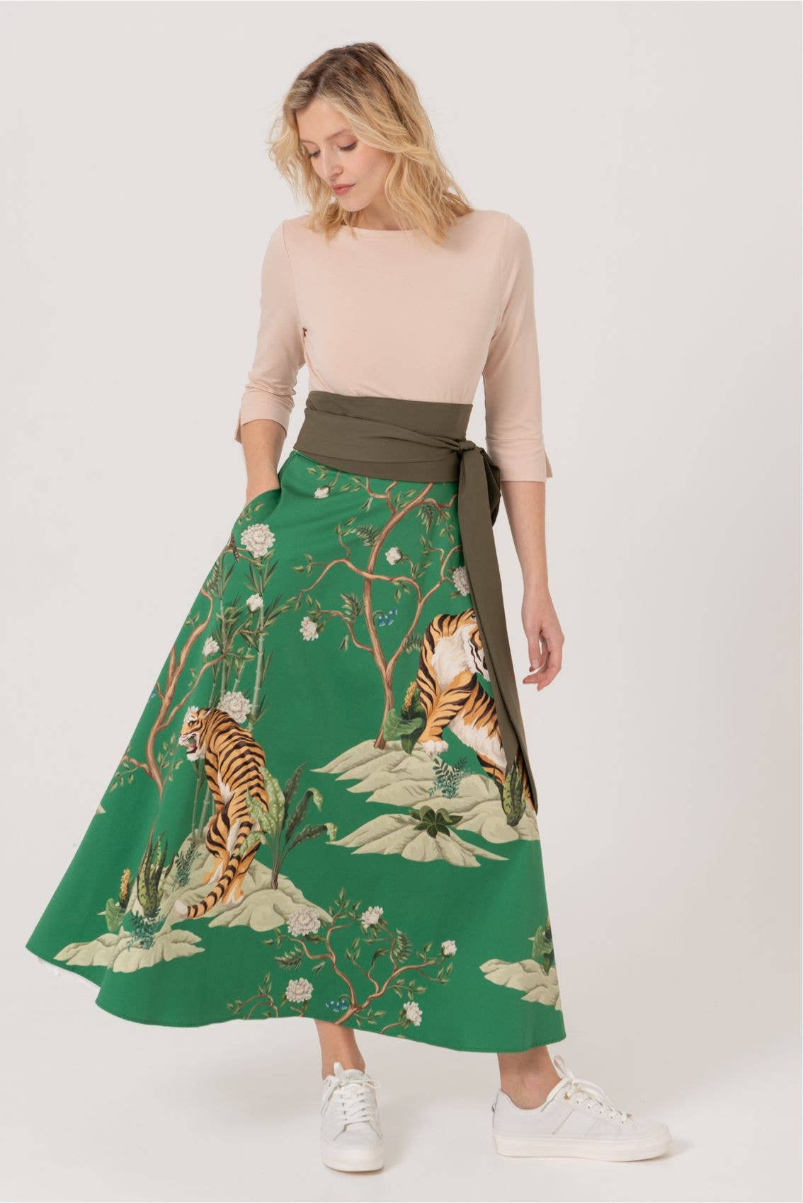 Our green skirt designed in with tiger print perfectly highlights your bold, confident style. The elegant A-line cut flatters your figure, while the practical side pockets are not only useful but also casual. Whether for everyday wear or special occasions – this skirt is a real eye-catcher that elevates your outfit to the next level.