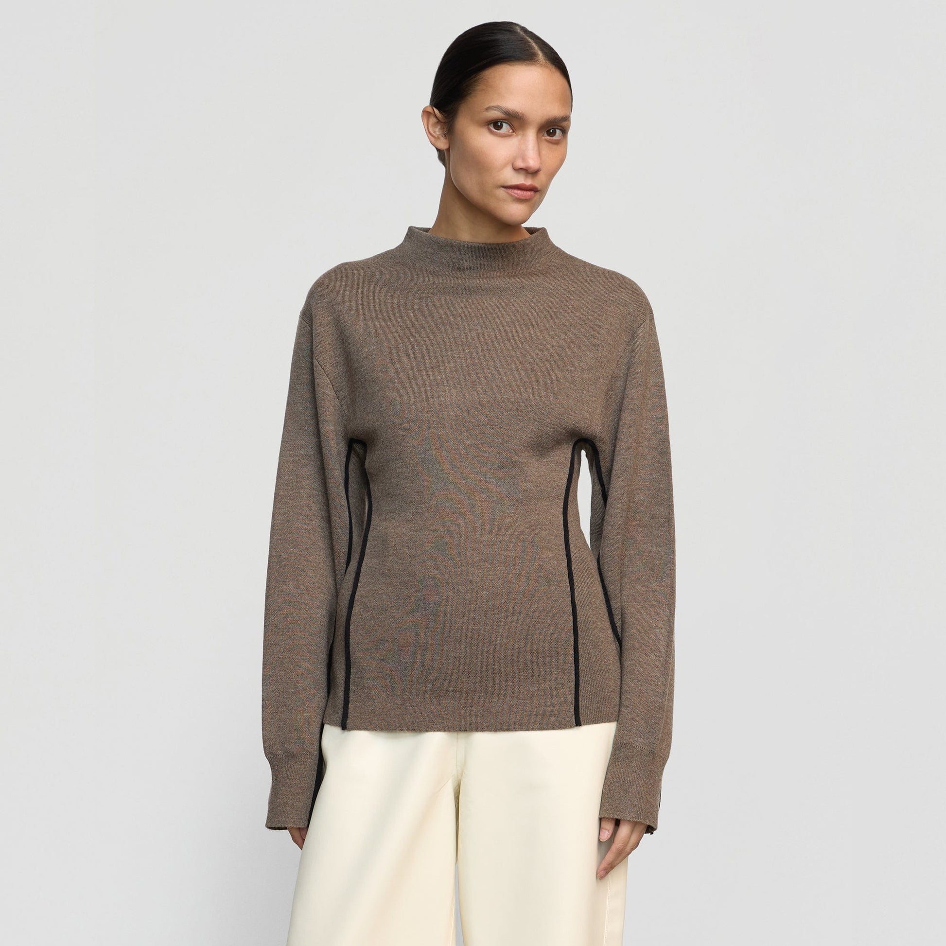 The Clarice Sweater features a medium-weight knit ideal for layering in cooler seasons. Its contrast piping offers a refined, minimalist look, making it versatile for both casual and professional outfits. Designed to enhance capsule wardrobes with a clean, modern style.
