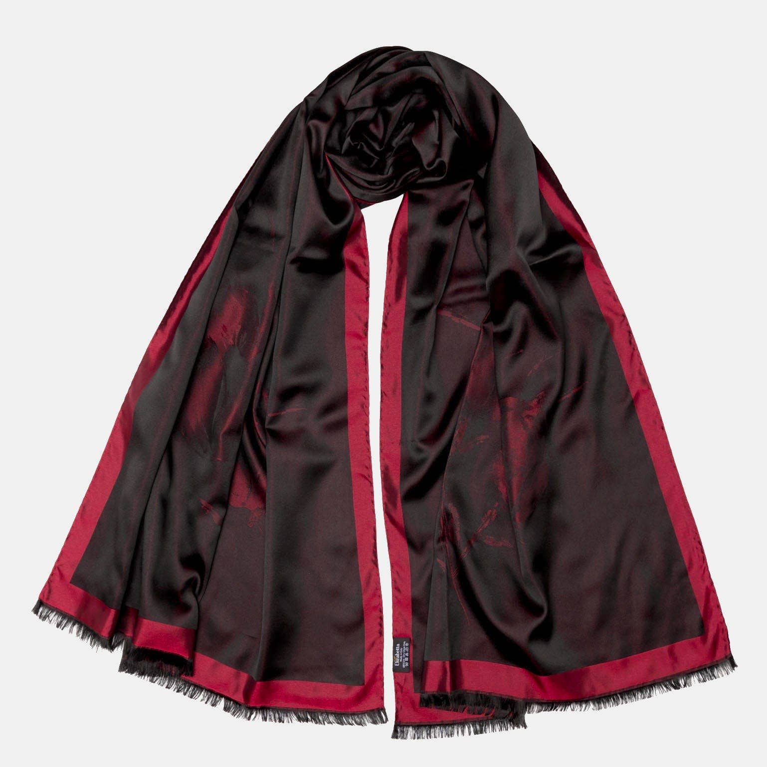 I’m thrilled to share one of our most exquisite pieces: an elegant evening shawl crafted from a rare, luxurious silk called organzino. This fabric is known for its luxurious feel and remarkable beauty, making this piece a true gem in any wardrobe. The shawl features a subtle, abstract tulip pattern woven in black and ruby red - an understated yet captivating design that plays beautifully with light. It’s reversible, allowing you to showcase either the rich black or the vivid ruby red side. This is one of those truly special pieces that exudes sophistication, making it perfect for unforgettable evenings. Details * Generous size: