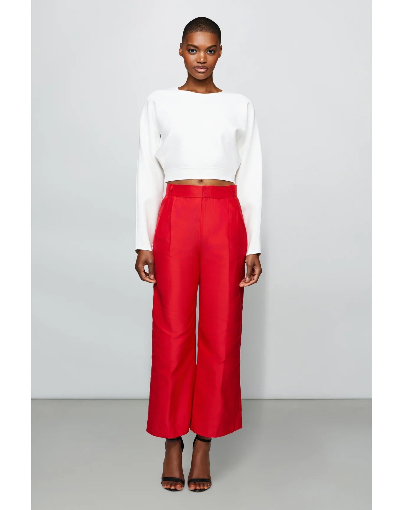 Bold and tailored, these cropped pleated pants in scarlet red taffeta bring a structured edge to any look.