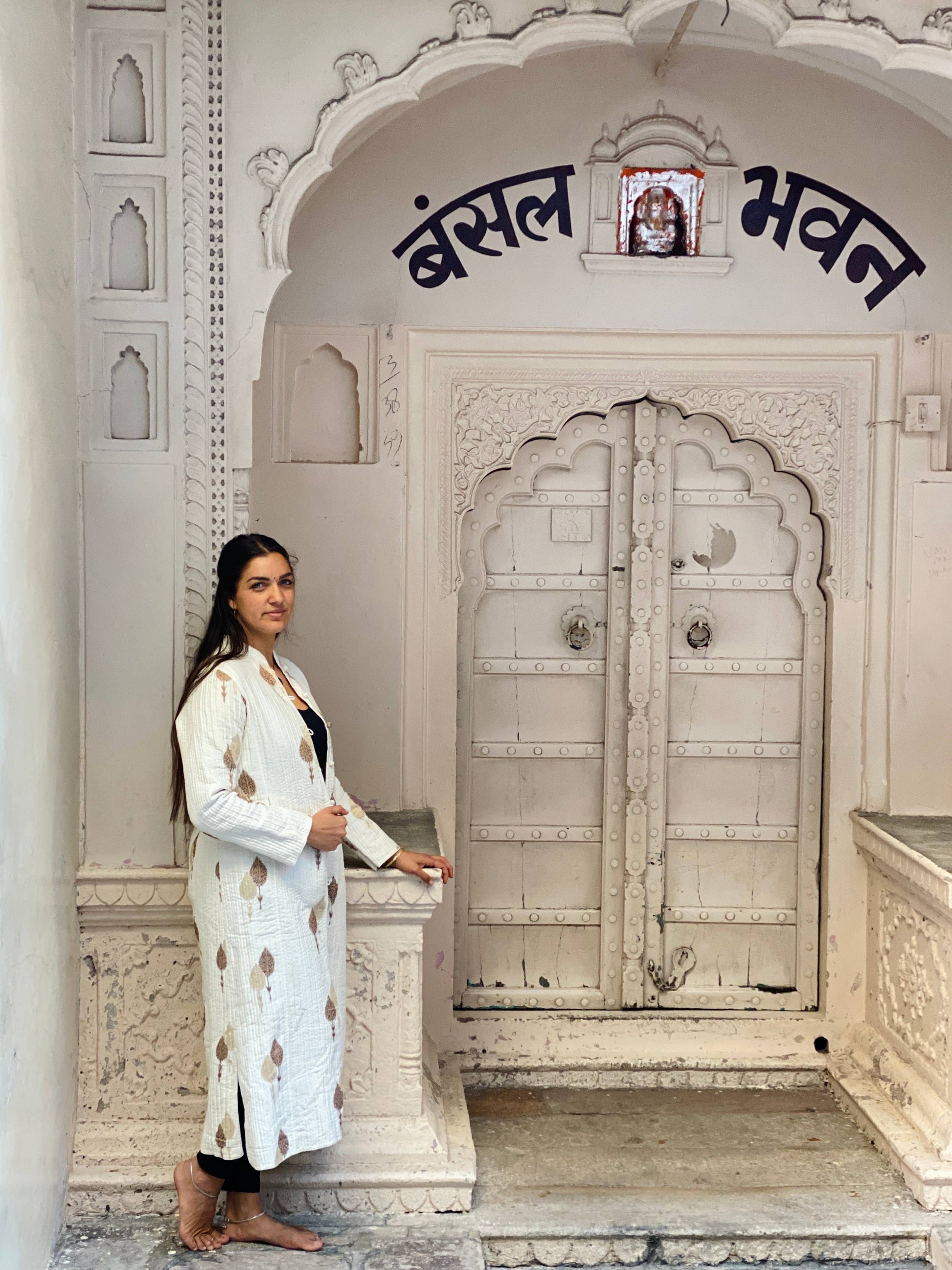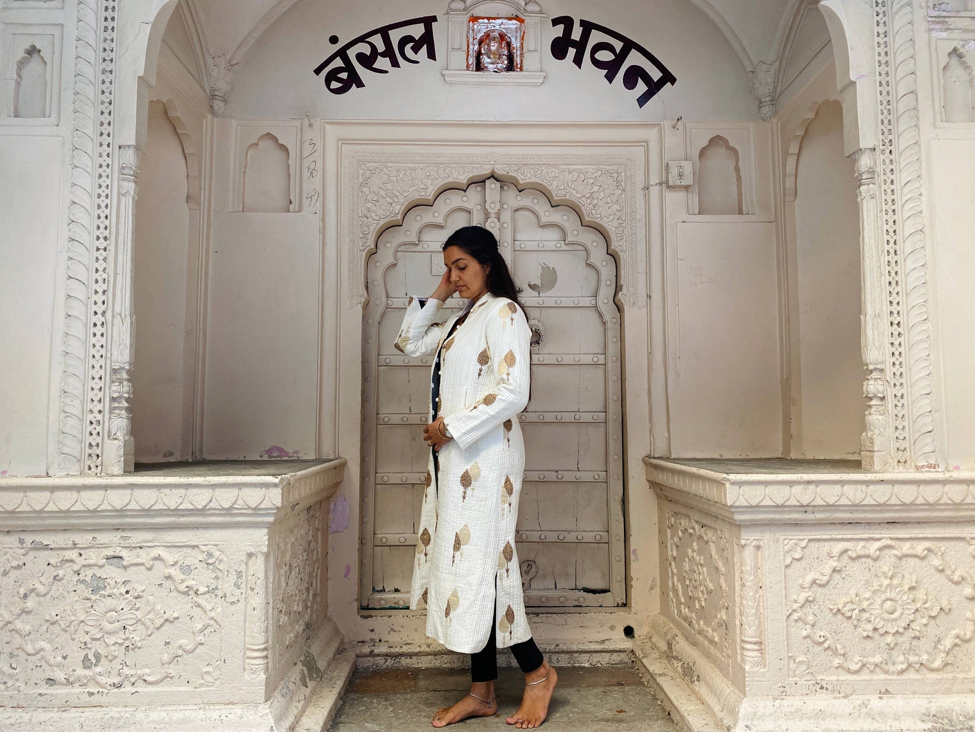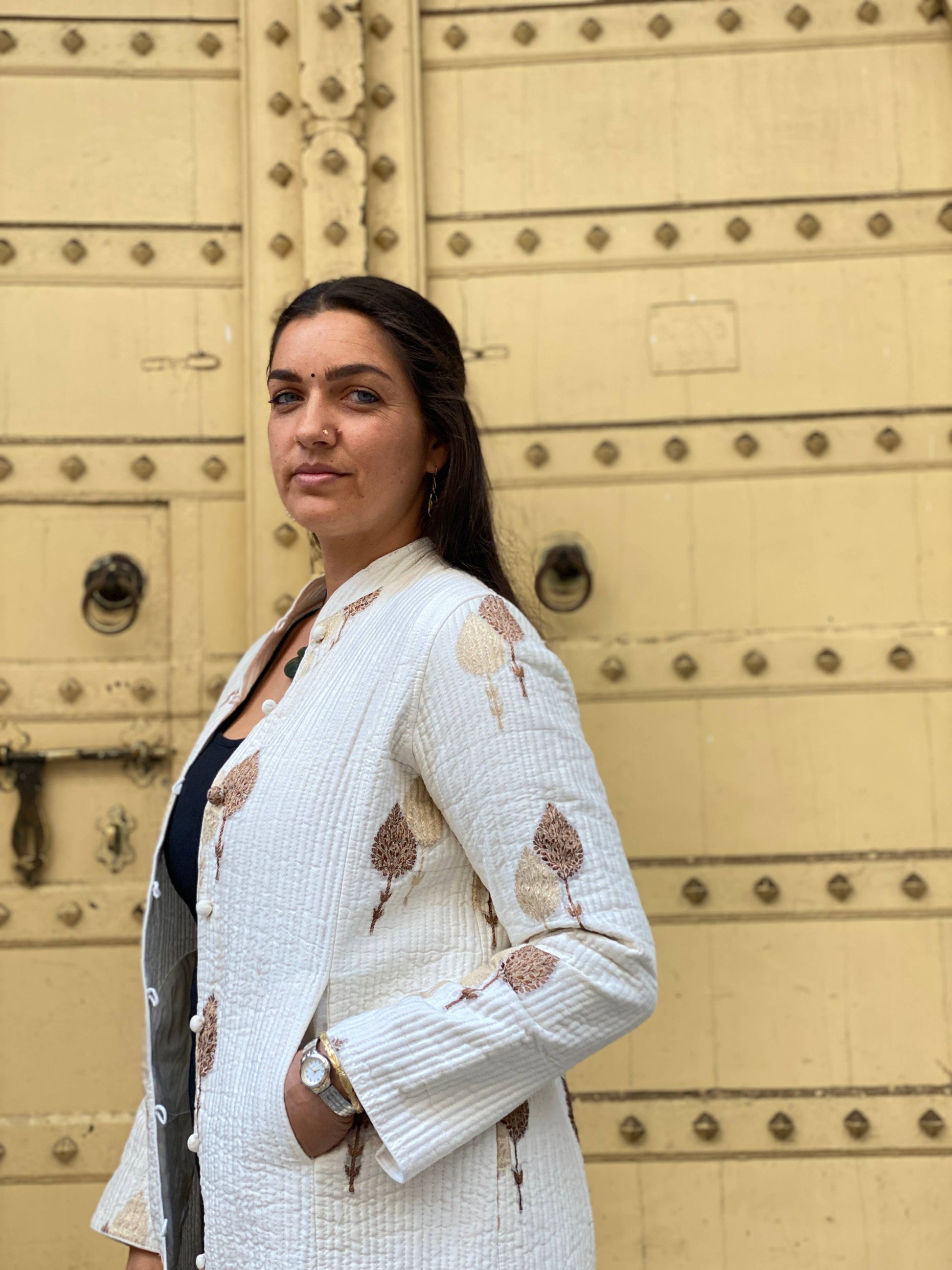 This Long Quilted Daya Coat features a weave of a tree design onto silk fabric, featuring two side pockets with Dorset buttons.