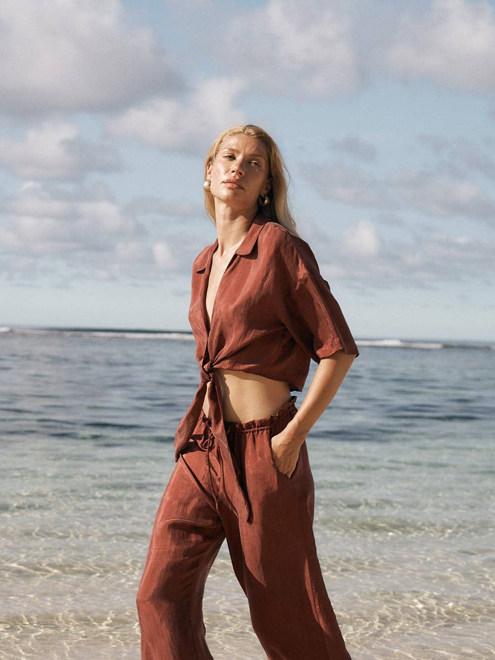 Effortless with a touch of modern sophistication, this tie-front shirt is designed for both ease and elegance. Featuring a relaxed, slightly cropped silhouette with a collared neckline, oversized short sleeves, and a statement tie-front detail, it’s crafted from a luxurious fabric that offers a subtle sheen. Perfectly versatile, this piece pairs beautifully with our Lucid Flow Tie Shorts or Lucid Flow Tie Pants for a polished yet laid-back look you’ll reach for time and again.