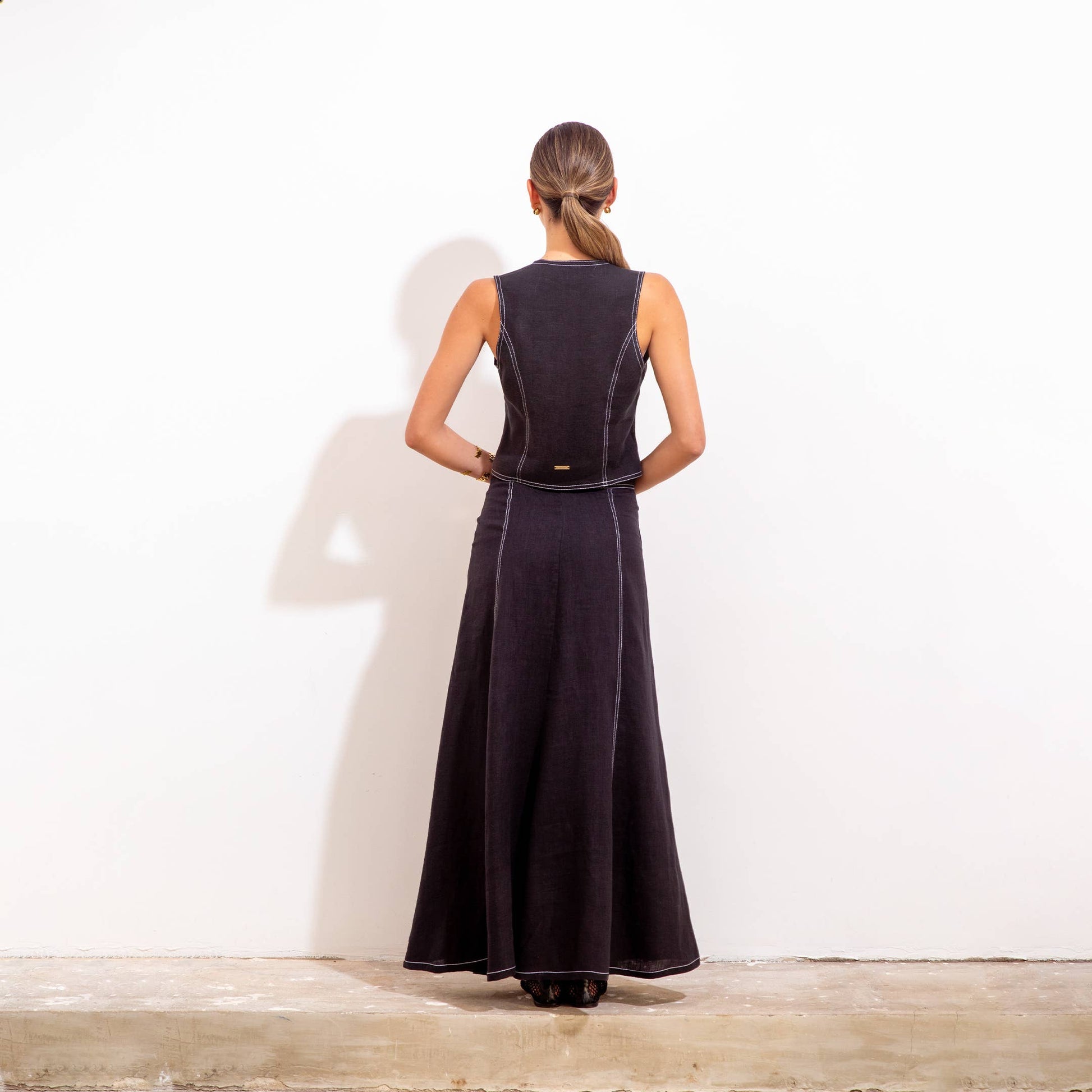 This exquisite linen skirt exudes elegance and sophistication. The detailed seams drapes beautifully creating a flattering silhouette for all body types.