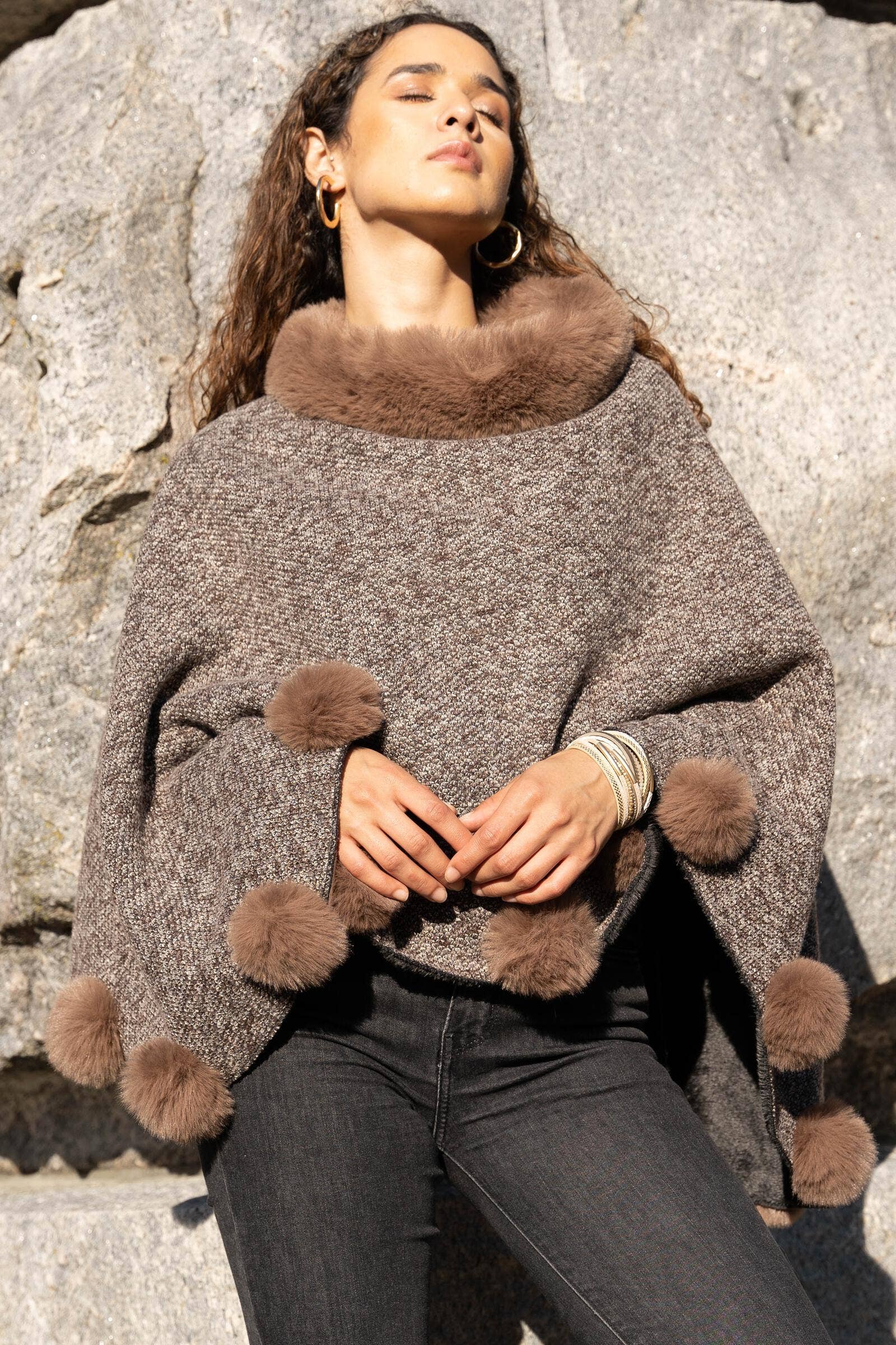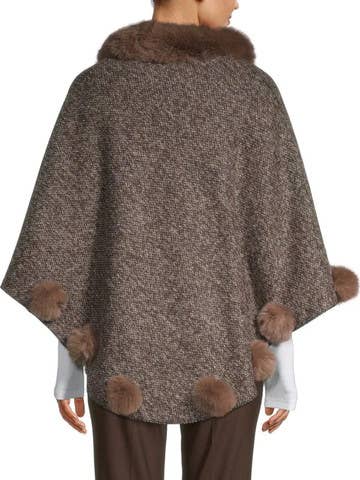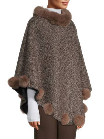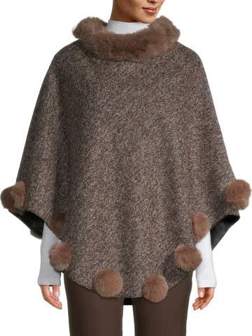"Shaped for comfort and unique style, this Posey Faux Fur Poncho features an oversized roomy silhouette with neutral-hue pompoms detailing the trim, adding an embellishment to the piece. Team yours with black leggings and knee-high boots for a chic outfit.