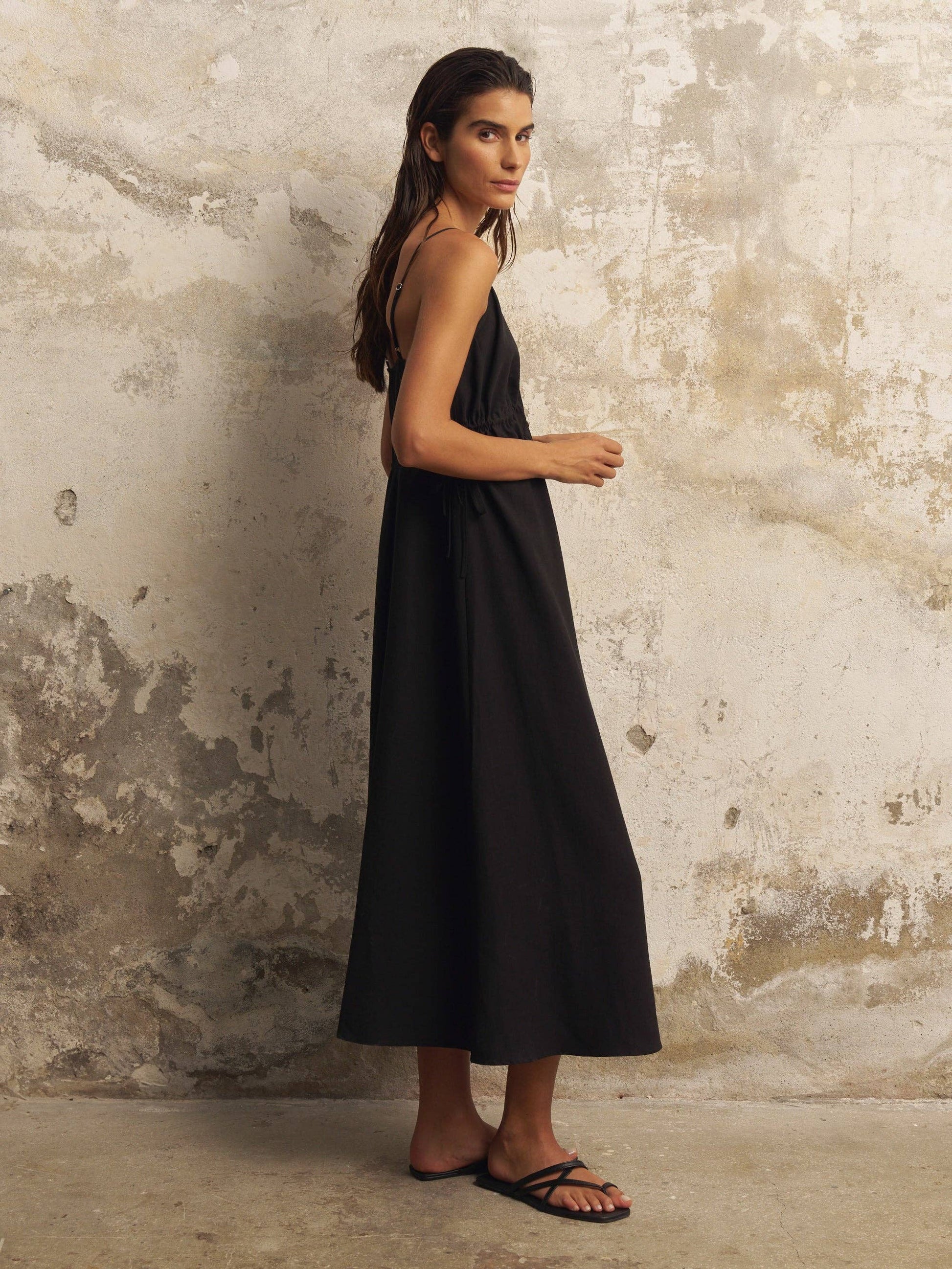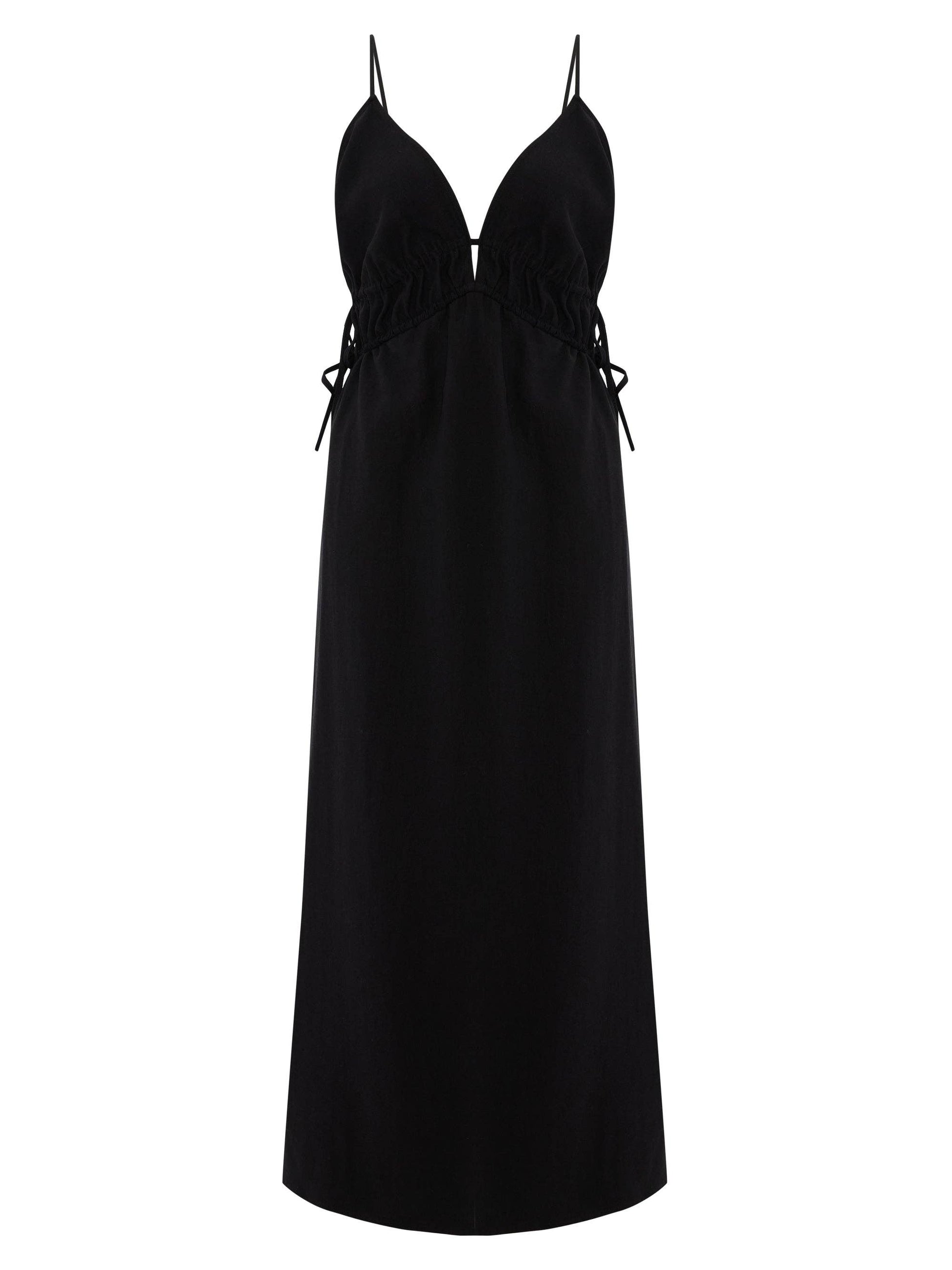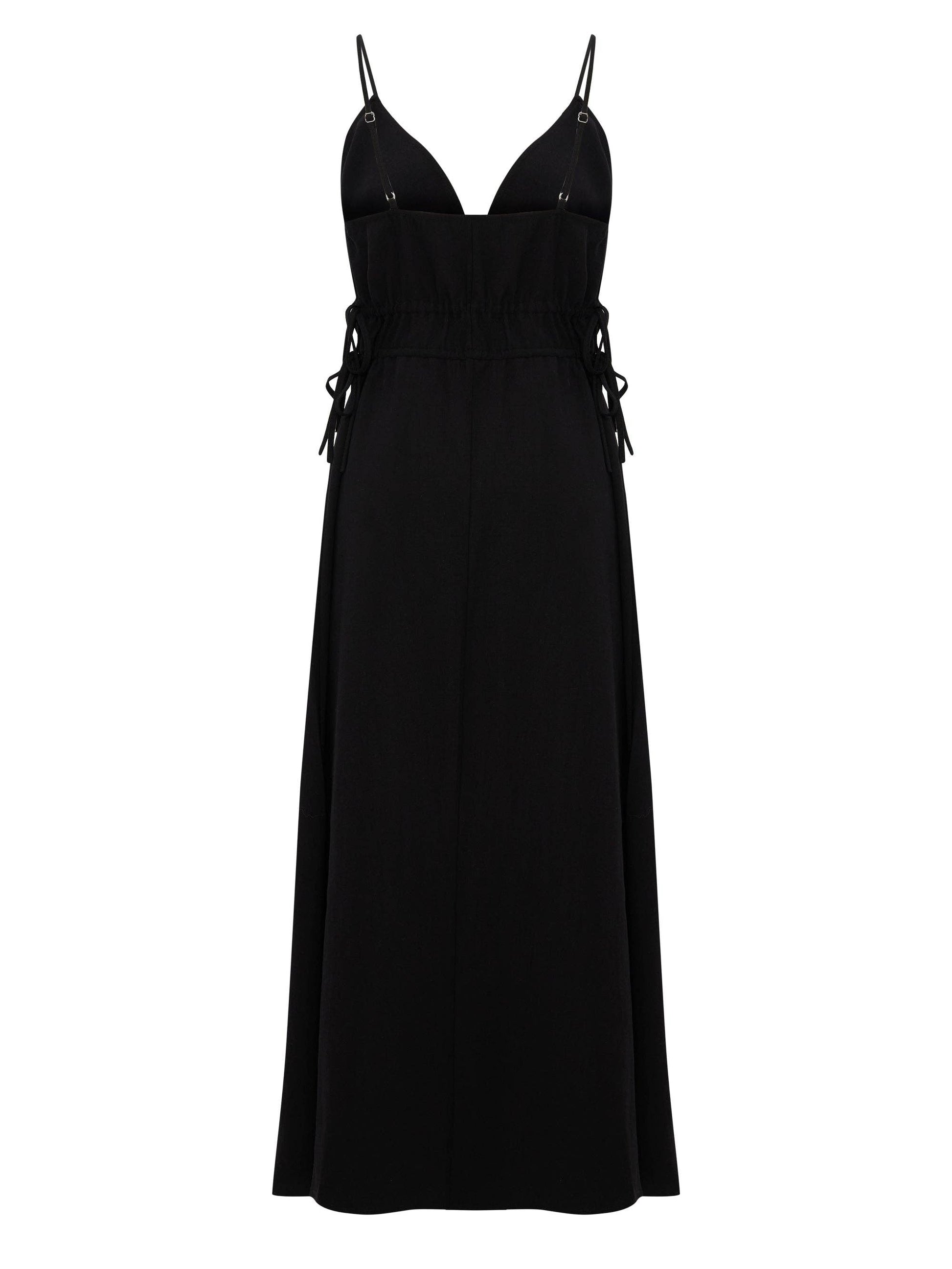 This maxi dress embodies effortless sophistication with a relaxed silhouette and fluid movement. The deep V-neckline and delicate shoulder straps create an elegant, feminine touch, while adjustable tie details at the sides allow for a customizable fit. Designed for versatility, it transitions seamlessly from day to night, making it a staple for any wardrobe.