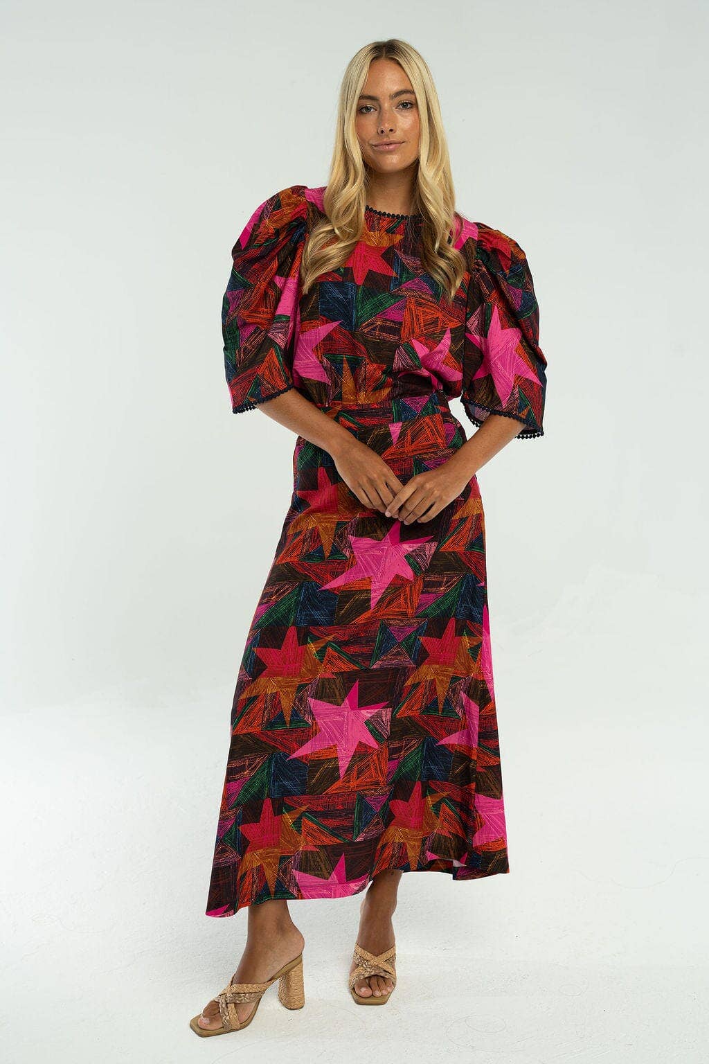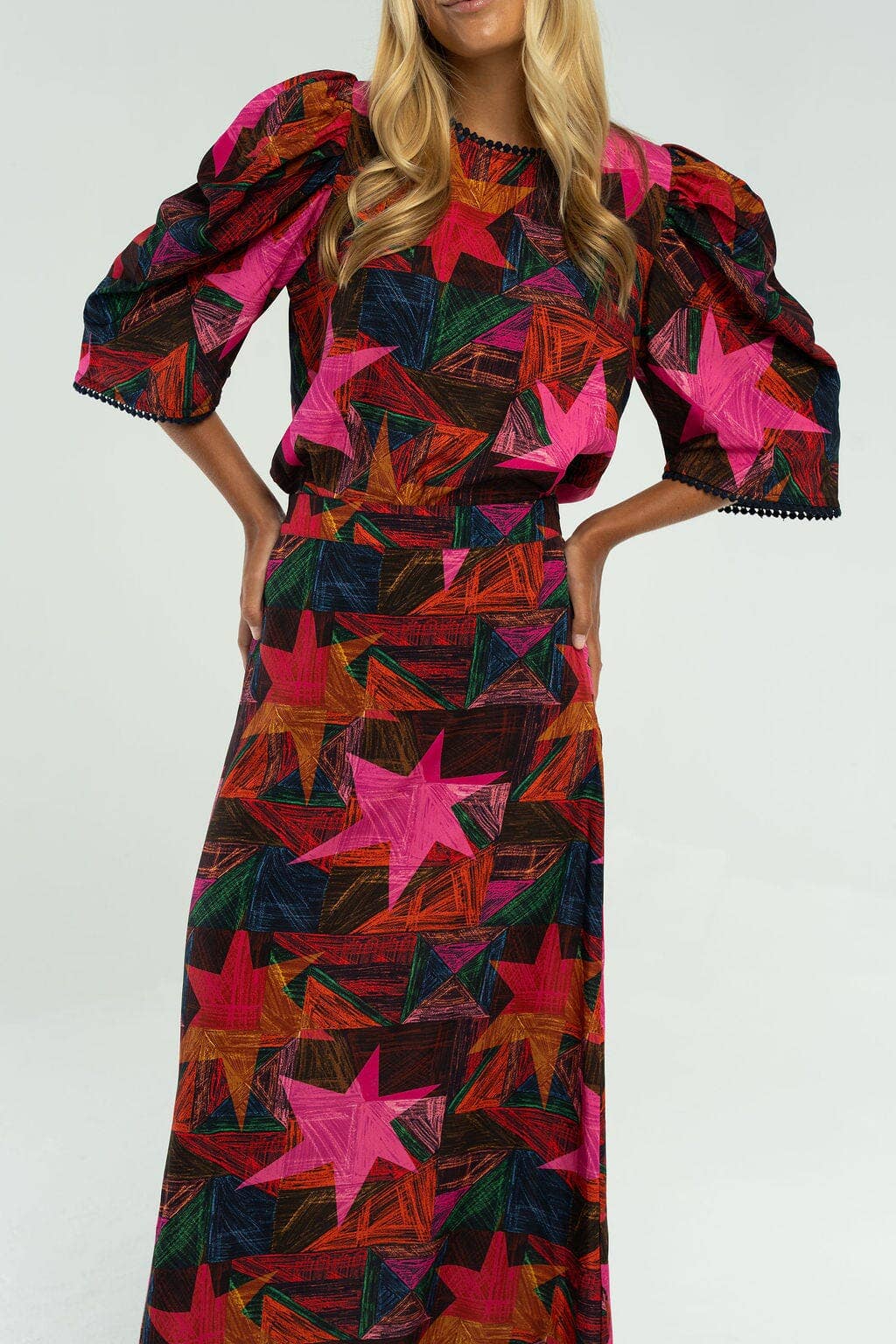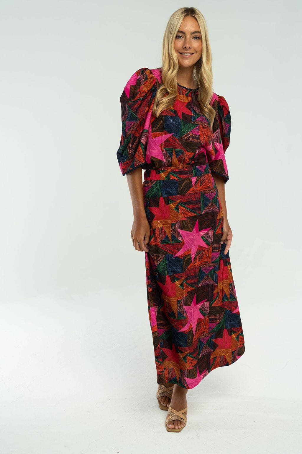 The Tiffany Skirt brings bold sophistication to any look. Featuring a striking star print in vibrant shades of pink, orange, and green, this midi-length skirt offers a flattering, flowy silhouette with a comfortable waistband.
